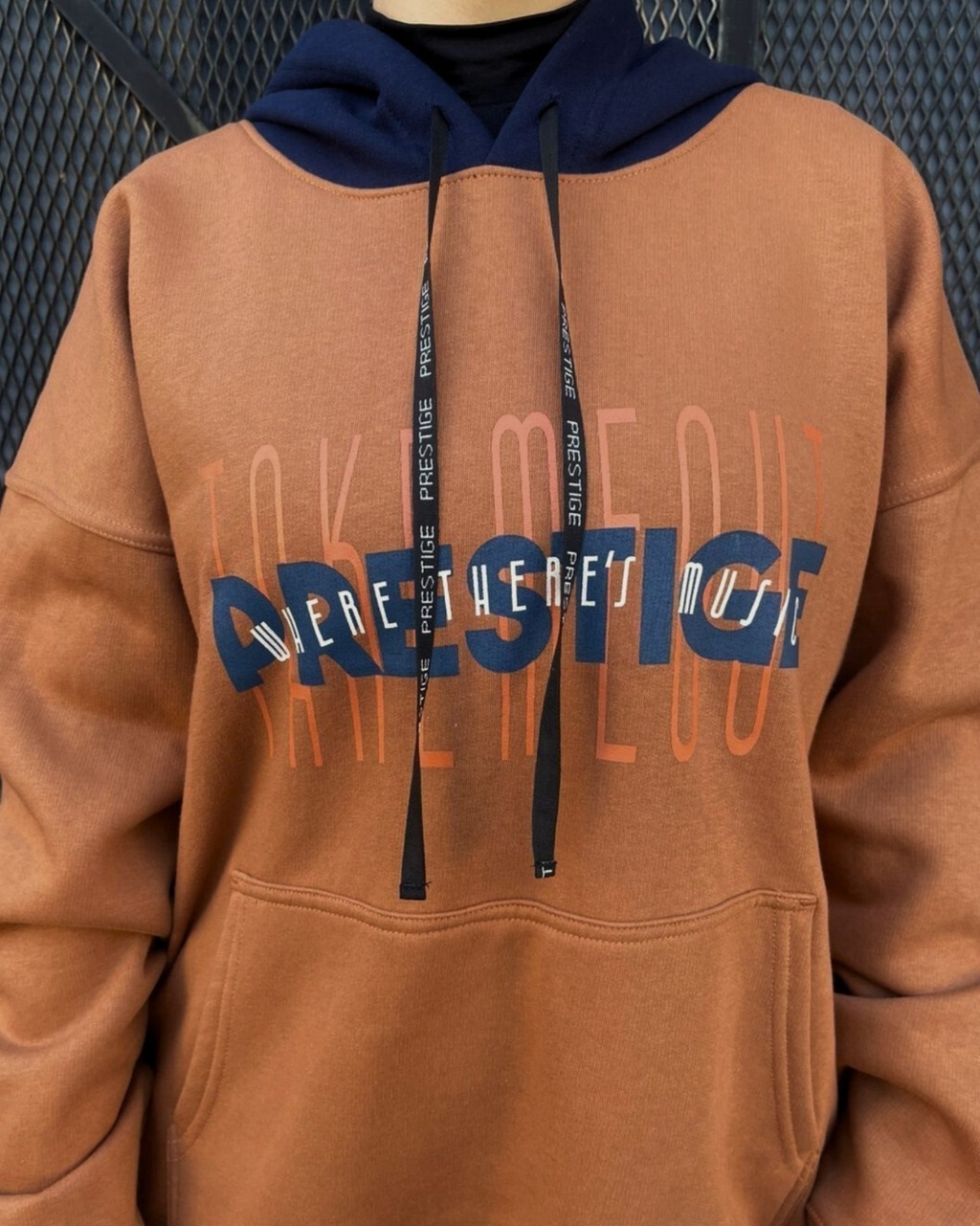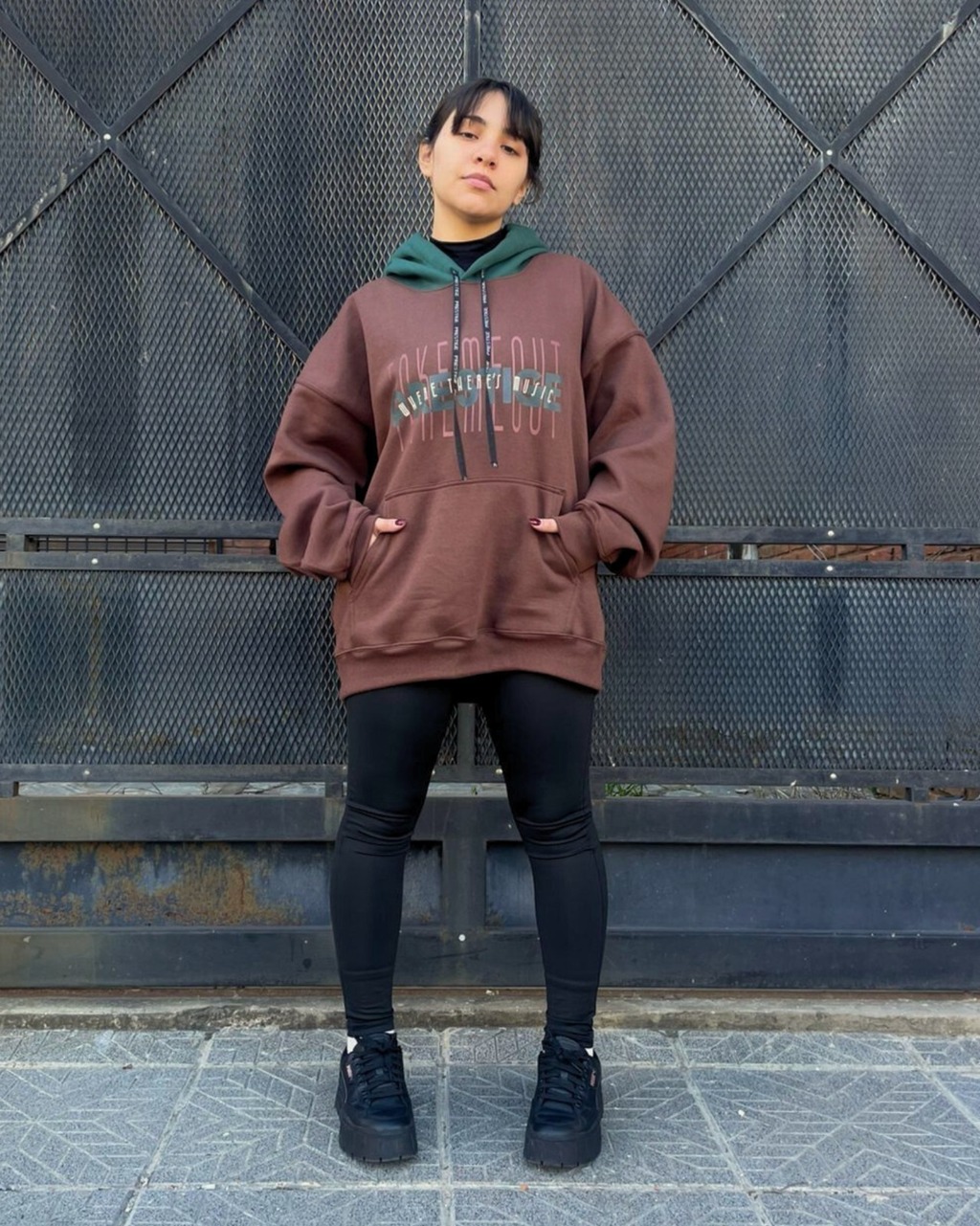 Buzo oversize de frisa invisible, con capucha combinada y estampa delantera en serigrafia.